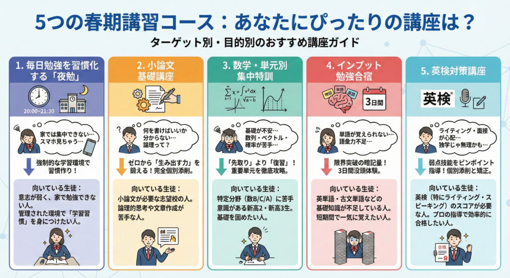 現状の学力と志望校のレベルを比較し、逆算から必要な参考書・勉強量を明らかにし、志望校に間に合うように適切な勉強計画を立てます。